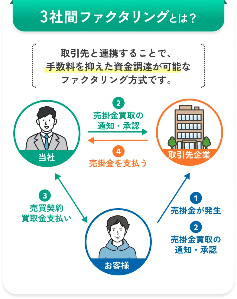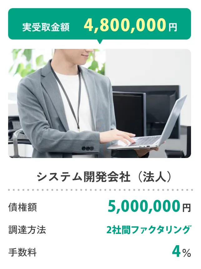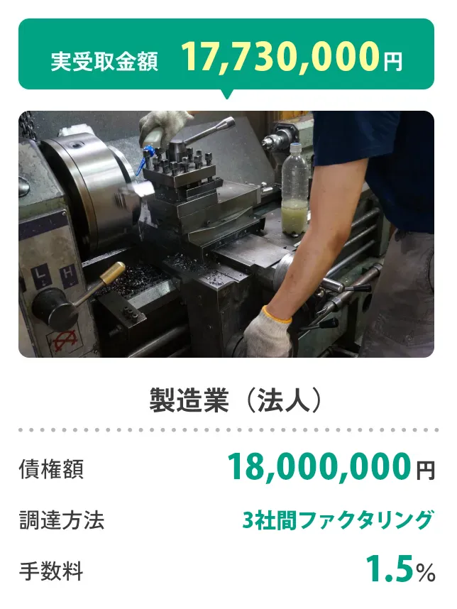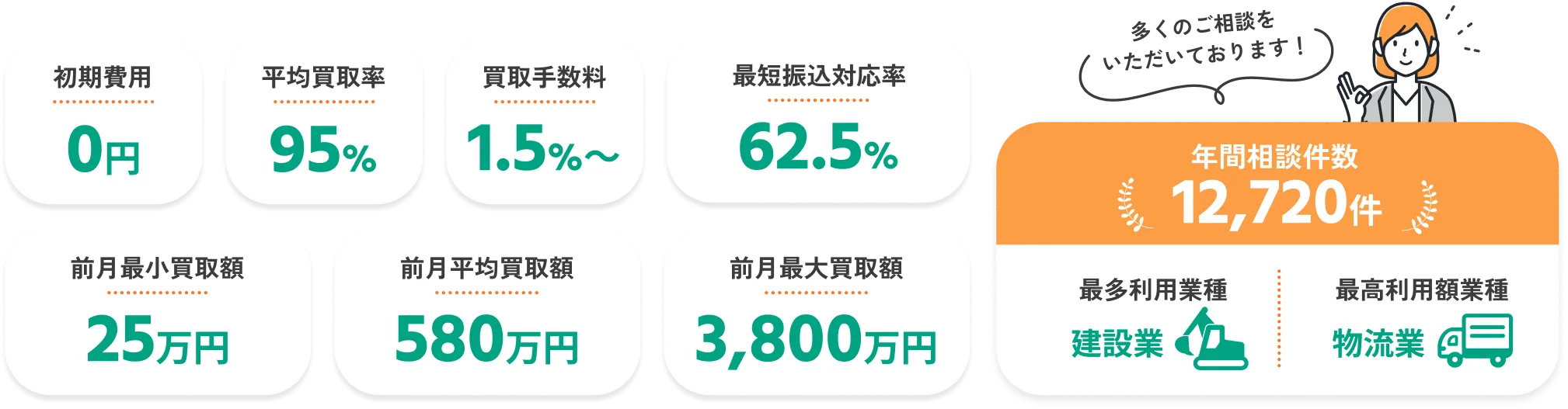 原則として、1つの売掛先につき買取可能な上限額は1億円までとしております。ただし、売掛先企業の規模や信用力、取引実績や期間などを総合的に確認したうえで、上限額を超えるお取引に対応できる場合もございます。まずは一度ご相談ください。