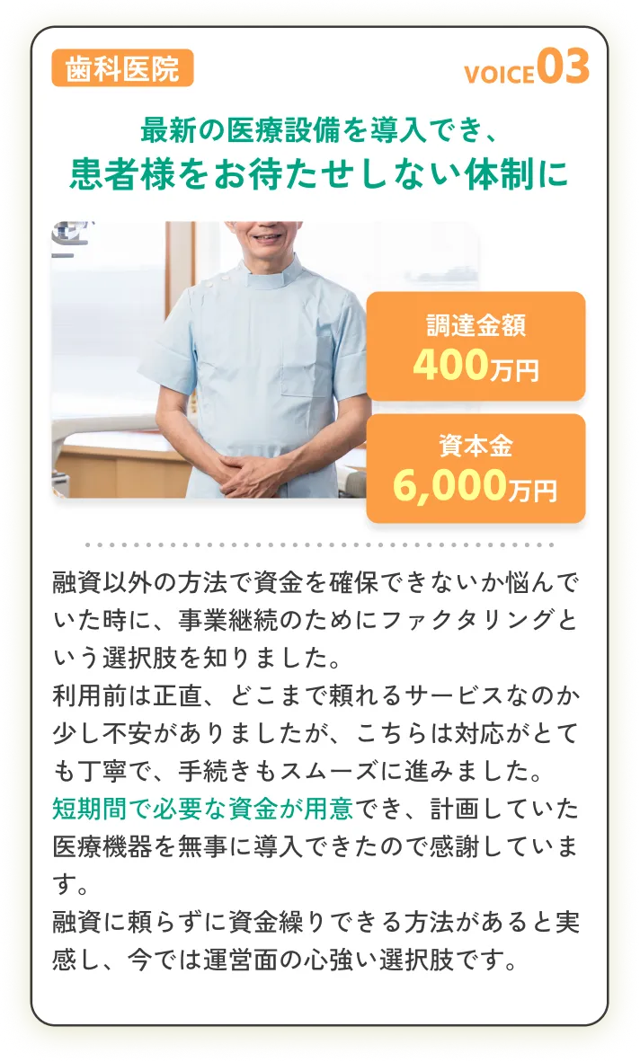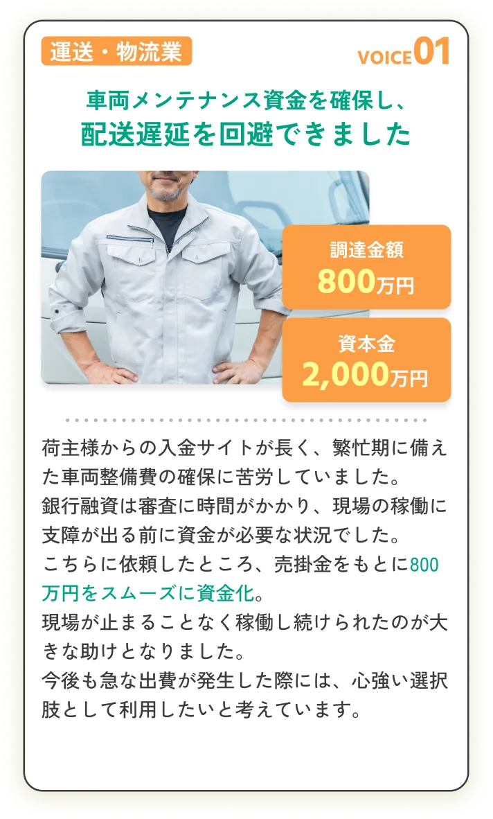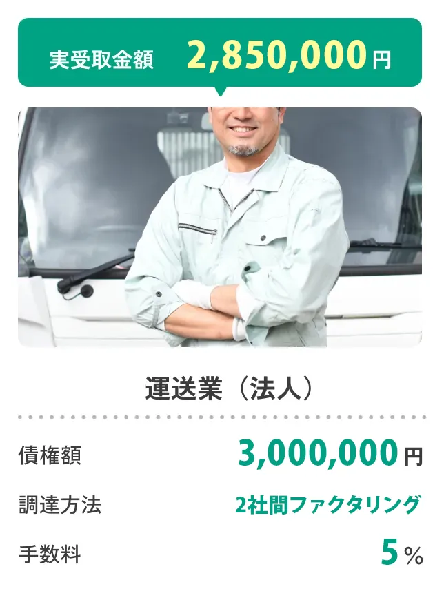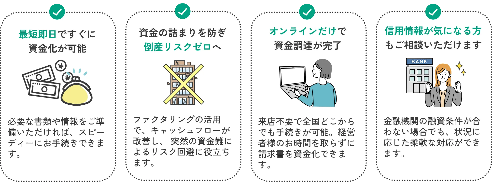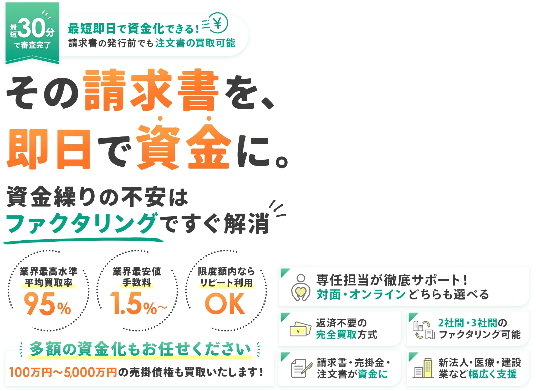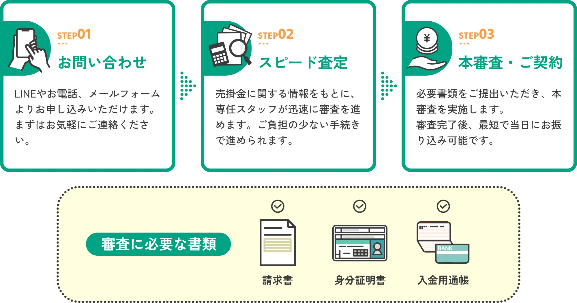 ご利用いただけるのは、売掛債権の請求額が30万円以上の場合となっております。条件を満たしていればお申し込みいただけますので、まずはお気軽にご相談ください。